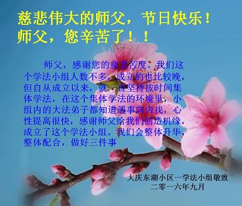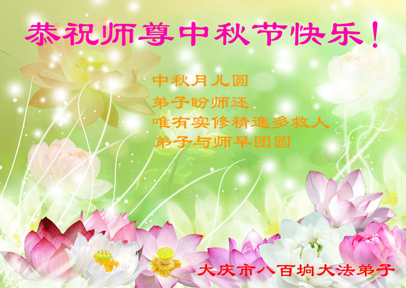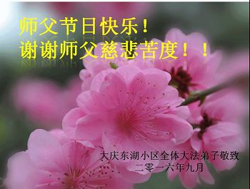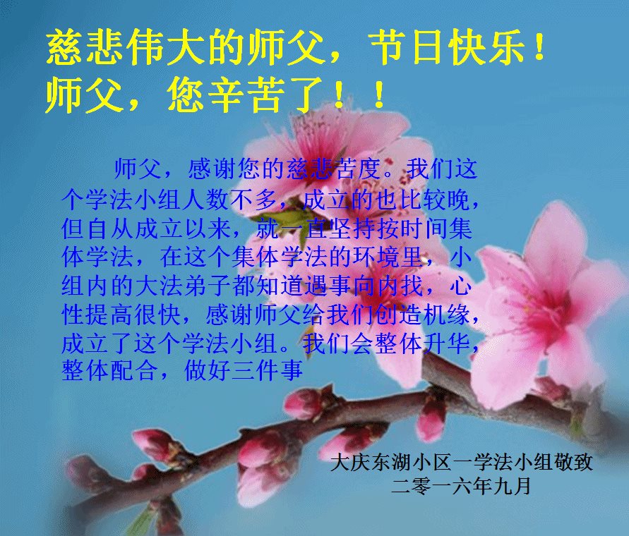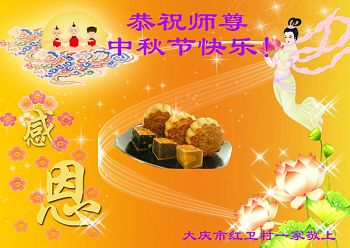 【明慧网二零一六年九月十四日】 黑龙江大庆新村、祥阁、火炬大法弟子恭贺师父中秋节快乐!