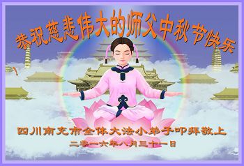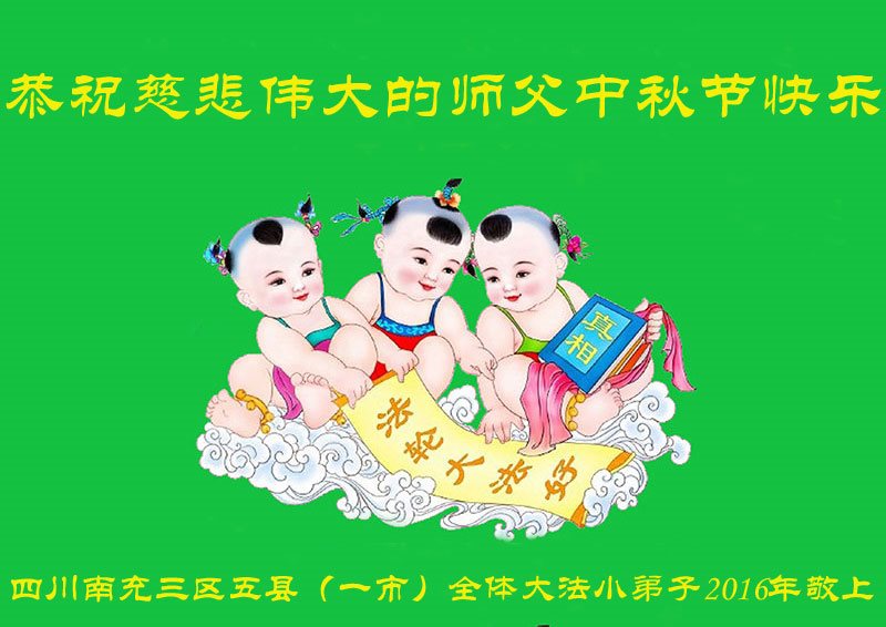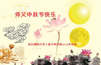 时光匆匆,弹指一挥间,又是一年金秋。这半年里,弟子走过许多弯路,一次次的错误换来我一次次的成长,我不断在问题中得到新的领悟,也一直在邪恶的迫害下坚定地走正我的路。这半年里虽有诸多不如意的地方,但在以后的修炼中,弟子一定会更加精進,做好自己该做好的一切,在正法的最后关头,勇猛直前,不让师父操心。 恭祝师尊中秋节快乐!谢谢师父给予我的一切! 大连大法小弟子 二零一六年九月四日 四川遂宁一大法小弟子及家人恭祝师尊中秋快乐!