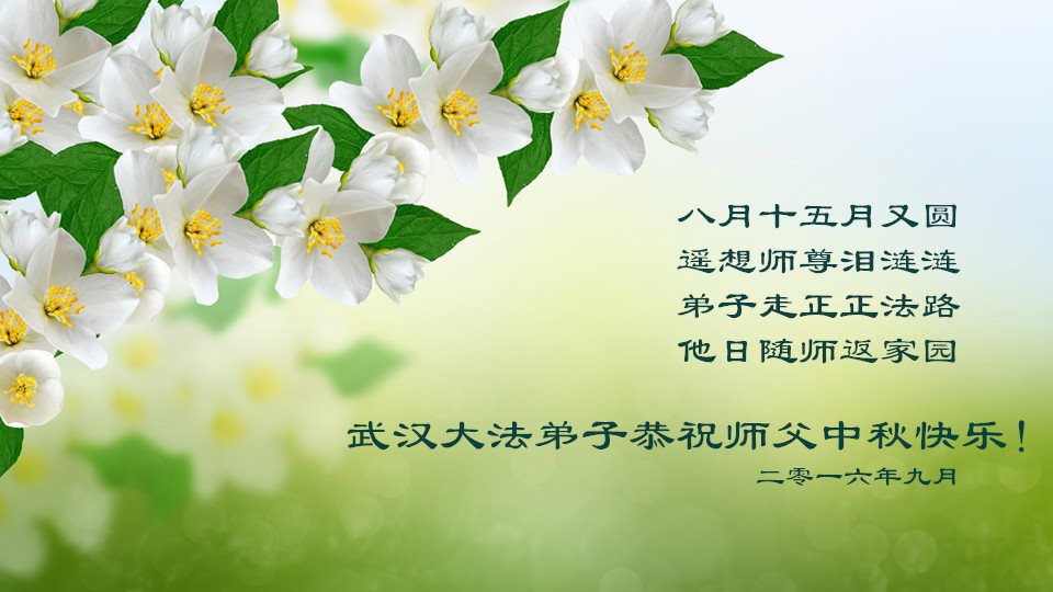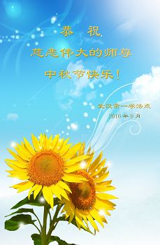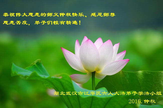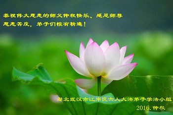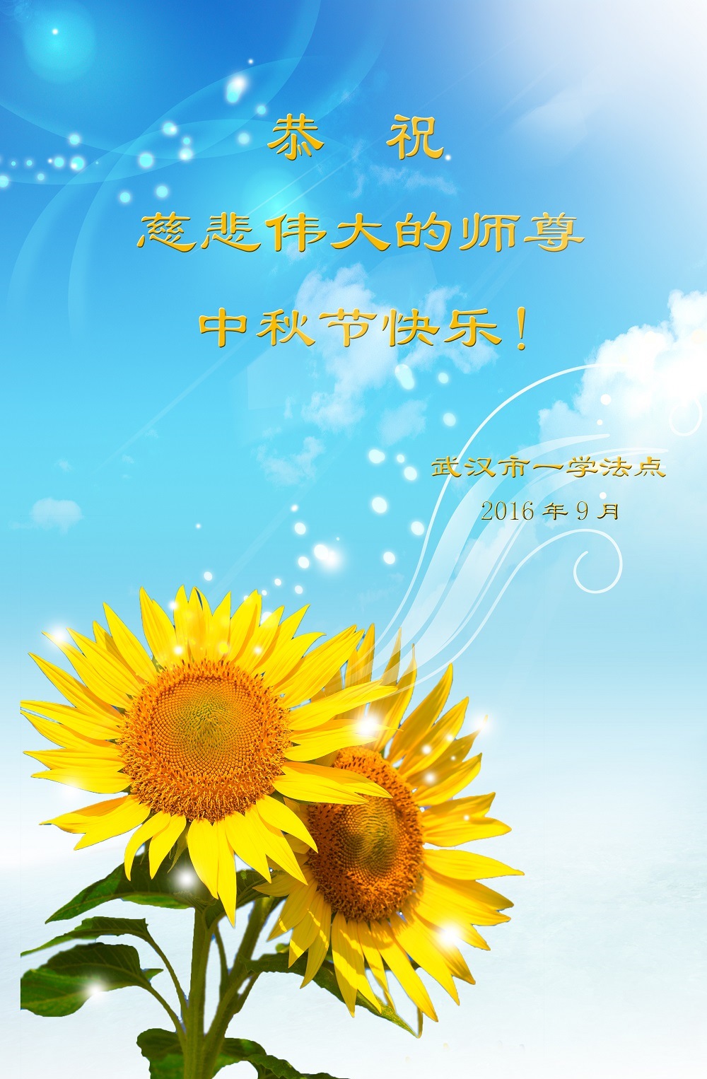 感谢师父的慈悲苦度!您为我们大法弟子操碎了心,为我们承受着巨大的业力,延续来的分分秒秒时间都是为了度我们能回家,救世人有未来,我们要珍惜这万古的机缘,做好师父要求的三件事,不辜负师父的慈悲苦度。让师父少操心,让师父笑。 值此佳节,送上我们全家人对师尊的问候,恭祝师父中秋快乐! 武汉大法弟子(母女俩)及家人 2016年9月13日 湖北省武汉市汉阳区一学法小组全体大法弟子恭祝师尊中秋节快乐!