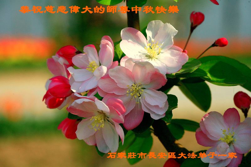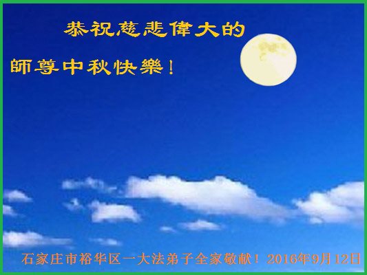 在中秋节到来之际,我们全家祝师尊节日快乐!“真善忍好!法轮大法好!”都深深镌刻在全家每个人心中。不论从身体上还是从心性上,都深受裨益,全家人和睦相处,其乐融融!而且都很乐于助人,与街坊邻里关系和谐,真正体现出了佛光普照的幸福和温馨! 深深感谢慈悲伟大的师尊与无边无量的大法!衷心的再次祝愿师尊节日快乐! 歌声震霄汉 大法无边 光照大地山川 师尊慈悲苦度 众生得救尽开颜 今逢佳节 祝师快乐 歌声震霄汉 河北石家庄市一普通家庭全体敬贺 河北省石家庄市长安区一学法小组全体大法弟子恭祝师尊中秋节快乐!