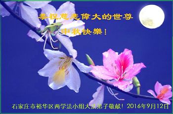 我们一定听师父的话,做好三件事,修好自己,多救人。让师尊少一分操劳,多一份欣慰。 河北省石家庄大法弟子恭祝师父中秋节快乐!