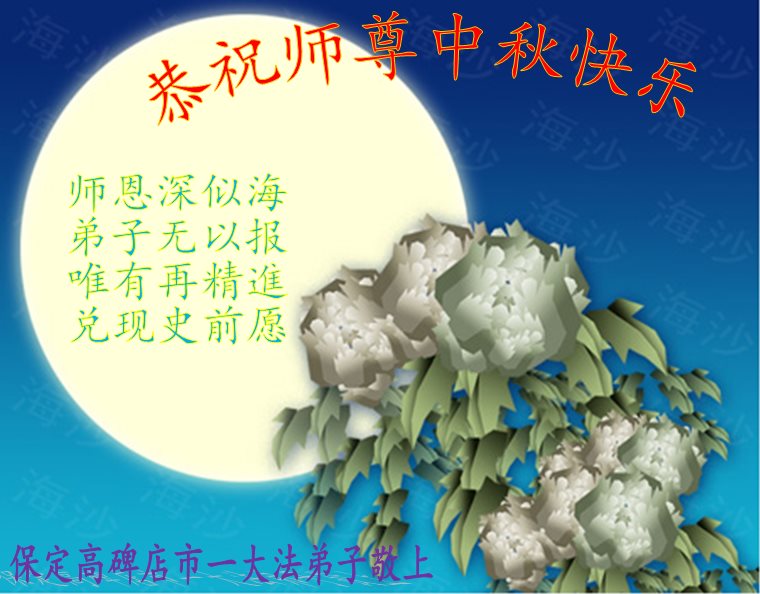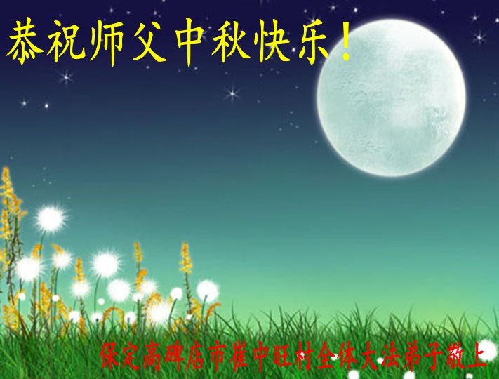 中秋佳节盼团圆,弟子们想念恩师无以言表,只有在最后的路上走好走正,以谢师恩。 浩瀚苍宇恶浪翻 师尊慈悲大法传 众生感恩能得救 永世大法万古流 河北省保定市定兴县全体大法弟子恭祝师父中秋快乐!