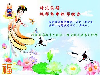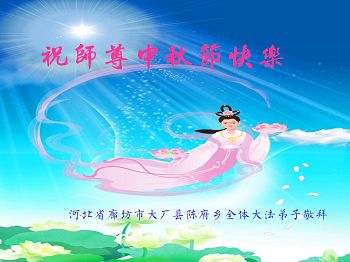 在中秋佳节到来之际,中国大陆河北省张家口市铁路系统母子俩大法弟子恭祝伟大的师尊中秋节快乐!每逢佳节倍思亲,我们想念师尊,在此我们母子俩弟子给您磕头了!师尊好!真善忍好!法轮大法好! 河北省廊坊市大厂县陈府乡全体大法弟子祝师尊中秋节快乐!