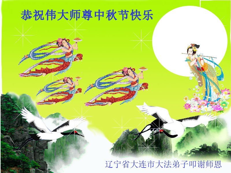 恭候师尊还 又是一年月儿圆 飞鸽越洋捎祝愿 祝愿师尊快乐!添 惟愿师尊少承担 骑虎难下快完玩 法徒救人忙不闲 等到正法结束时 众徒恭候师尊还 辽宁大连一学法小组大法弟子恭祝慈悲伟大的师尊中秋节快乐!