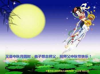 师父:弟子想念您!弟子还有很顽固的人心没有去掉,但弟子会努力的多学法,多发正念,去掉人心,在最后的时间里多救人,兑现史前誓约。师父您辛苦了!祝师父中秋节快乐! 山东青岛平度全体教育系统的大法弟子恭祝恩师中秋节快乐!