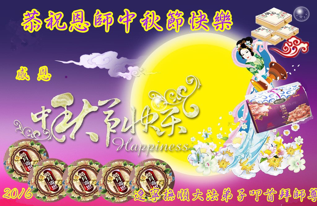 每逢佳节念师尊, 隔岸遥望谢师恩, 中秋佳节月儿圆, 盼望师尊回中原。 学法入心添正念, 去掉人心多救人, 弟子精進再精進, 助师正法了洪愿。 弟子恭祝师尊好!师尊中秋节快乐! 辽宁抚顺一大法弟子敬上 二零一六年九月九日 辽宁省阜新大法弟子恭祝师尊中秋快乐!
