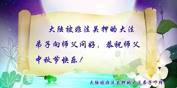 虽然我们身体被束缚,但是我们坚修大法到底! 北京大法弟子仅代表所有被非法关押的大法弟子向慈悲伟大的师尊问候! 上海徐汇区一中年大法弟子及上海提篮桥被关押的大法弟子恭贺伟大的师尊中秋好!