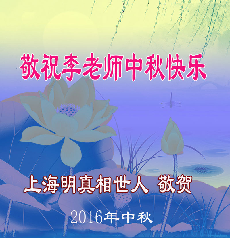 中共邪*党-如今是秋后的蚂蚱,蹦跶不了几天了!我们作为大法修炼者的家人,也从心里高兴,这些年的苦他们没有白吃!寒冷的冬天就要过去了,阳光明媚的春天就要到来!您与弟子团聚的时刻也不远了!我们盼望着慈悲伟大的李大师早日回归故国! 上海明真相世人敬祝李老师中秋快乐!