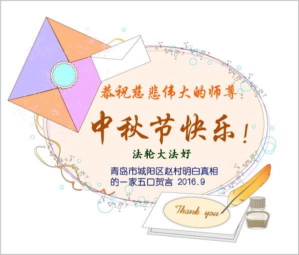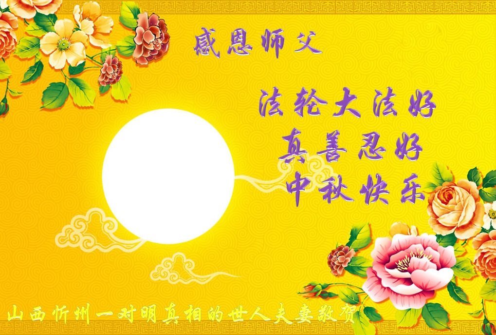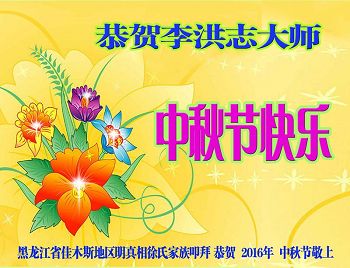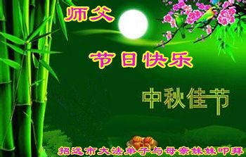 尊敬的师父好! 年年中秋,今又中秋,由于被迫害,我们年年都没赏月。今年邪*党-又下发秘密文件,操控公检法人员转化弟子,逼迫大法弟子写几书。现在已有被逼迫写、签字的事情发生。我们悟到,这是旧势力搞的鬼,借口以此恶行考验大法弟子,我们说,他们不配考验大法弟子,唯有我师父才配考验弟子。我们发正念:全盘否定旧势力的一切安排,不承认它们安排的一切,就走我师父安排的路,不许警察等恶人到大法弟子家、单位或电话骚扰迫害大法弟子,更不允许它们抓打关判大法弟子。师父给我们做主,我们就是要多救人,快救人。 由于自己太笨,到现在都学不会制作贺卡。希望师父少一份操劳,多一份欣慰,希望师父和家人早日回国,我们非常的期盼神韵早日回国。 黑龙江省齐齐哈尔市十余名大法弟子及明真相的世人恭祝师父中秋快乐!全家快乐! 河北石家庄大法弟子携明真相的婆婆、女儿、女婿、儿子共5人恭祝恩师中秋节快乐!