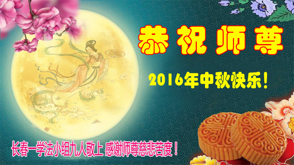 德惠市大房身镇全体大法弟子恭祝师尊中秋佳节快乐!我们一定配合做好三件事,不辜负师尊的慈悲苦度。 大房身镇全体大法弟子 叩拜 2016年9月12日 吉林省长春市宽城区一学法小组大法弟子恭祝慈悲伟大的师尊中秋节快乐!