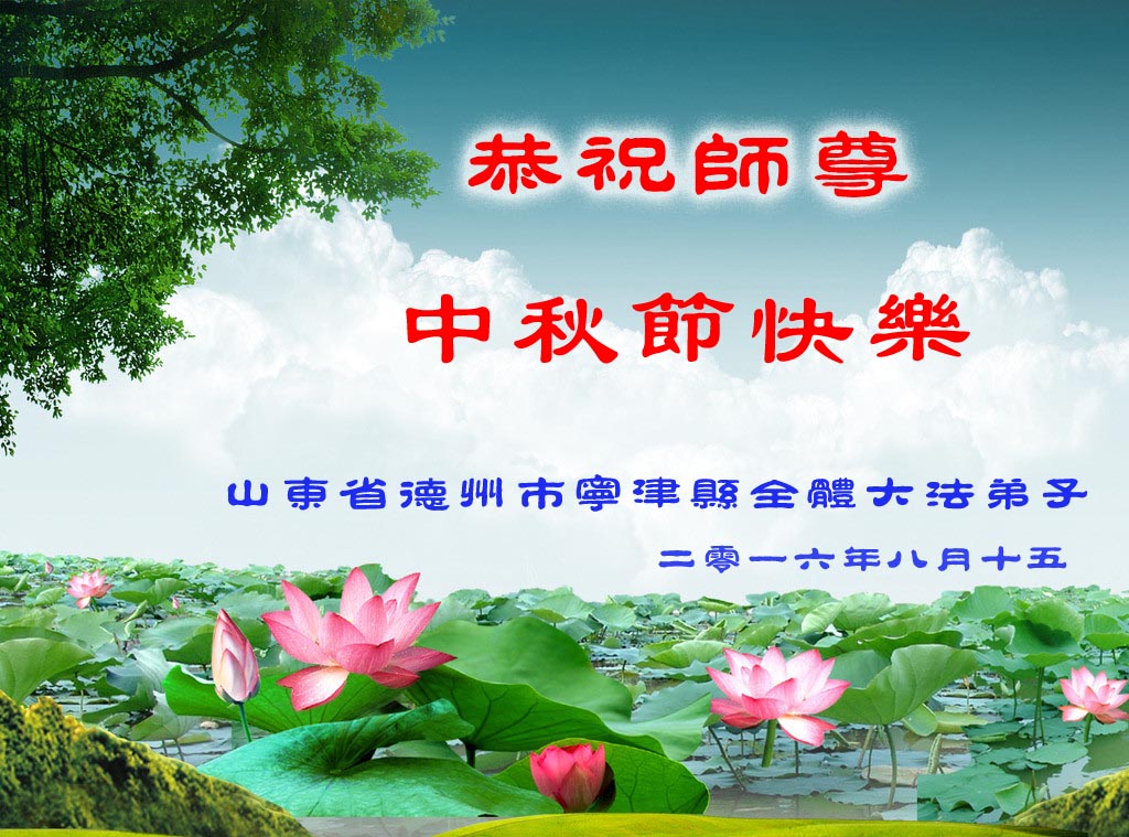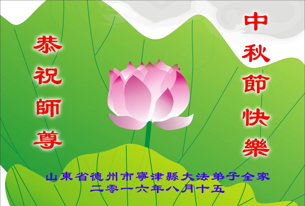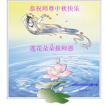 尊敬的师尊您好: 一年一度的中秋佳节快到了,弟子祝您节日快乐!感恩师尊慈悲救度!我们向师尊表示: 今后更加努力按师尊的教导,学好法,做好三件事,修好自己,多救人,兑现誓约。跟师父回家。 山东招远市大法弟子:兰英、滕兰、春翠、一平、百灵、庆祝敬上 2016年9月10日 辽宁沈阳一学法小组全体大法弟子恭祝师尊中秋节快乐