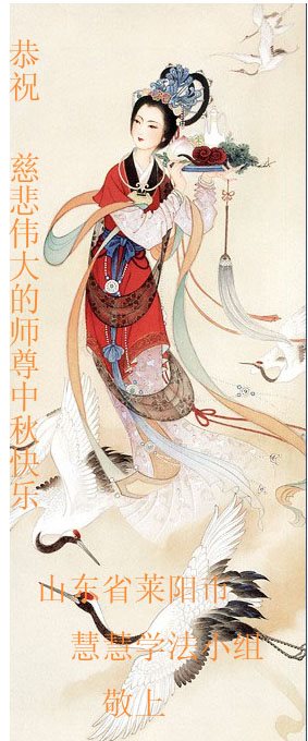 慈悲伟大的师尊好!用尽世间的语言也表达不了我们对您的感恩之心,师尊辛苦了!请师父放心,无论弟子们在哪个环境都会记住自己是大法弟子,做好三件事,修去人心和执着,助师正法,救度众生,完成自己的历史使命!弟子叩拜慈悲伟大的师尊! 山东省昌邑市饮马镇大法弟子恭祝伟大的师尊中秋快乐!