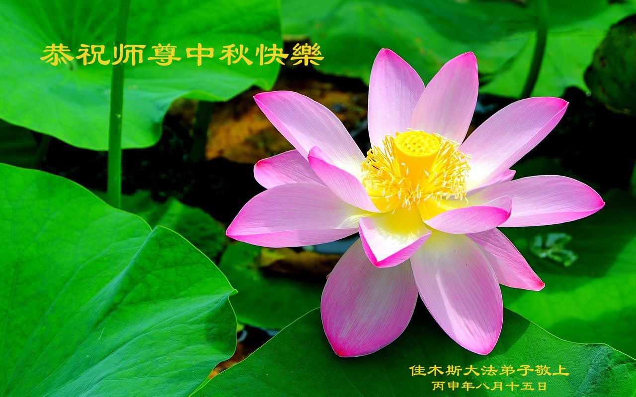 秋意浓浓,又是一年团圆日---中秋佳节至。 远隔重洋的师父:祝您中秋愉快! 愿您救度众生的洪愿了;愿您巨大的付出能得到回报,满庭莲飘香。 弟子感恩师尊洪传大法,有幸成为法轮大法的一员。走在返本归真的路上,感到幸福无比。 弟子们今后一定精進起来! 叩谢师尊!您辛苦了! 莱州家庭学法小组敬上 辽宁省辽阳市宏伟区大法弟子及家人恭祝师尊中秋节快乐!