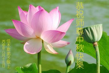 尊敬的师父中秋快乐! 我们全家都修炼,在此中秋佳节之际,我代表全家向尊敬的师父问好,祝师父中秋节快乐!弟子一定做好三件事,修好自己,圆满随师还! 跪拜师父 大连弟子 河南省郑州一学法小组全体大法弟子恭祝慈悲伟大的师父中秋节快乐!
