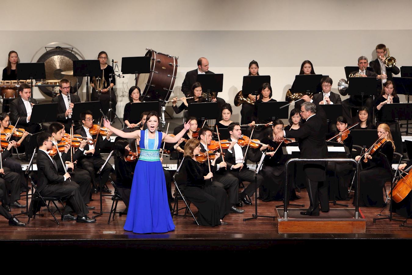 | 【明慧网二零一六年九月二十日】(明慧记者唐恩综合报道)首次莅临亚洲巡演的神韵交响乐团,二零一六年九月十七日在台湾桃园市中坜艺术馆展开台湾的首场演出,中度颱风马勒卡虽带来风雨,音乐会却出现大爆满的观赏人潮,结束时全场起立致意,掌声久久不息。 最后一首曲目《慈悲的展现》结束后到安可曲,现场掌声足足持续三分半钟,喝采声不间歇,音乐家谢幕多达九次,现场气氛热烈。观众席上爆出不绝于耳的鼓掌声、安可声,接连让乐团指挥米兰·纳切夫(Milen Nachev)登台向观众谢幕七次,另外两次由声乐家们代为谢幕。  图1:女高音歌唱家耿皓蓝的演出 |