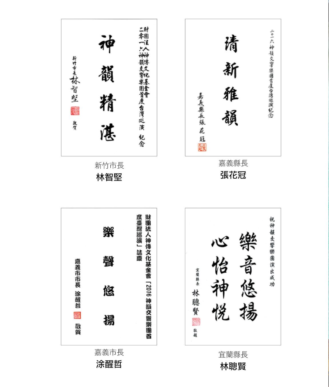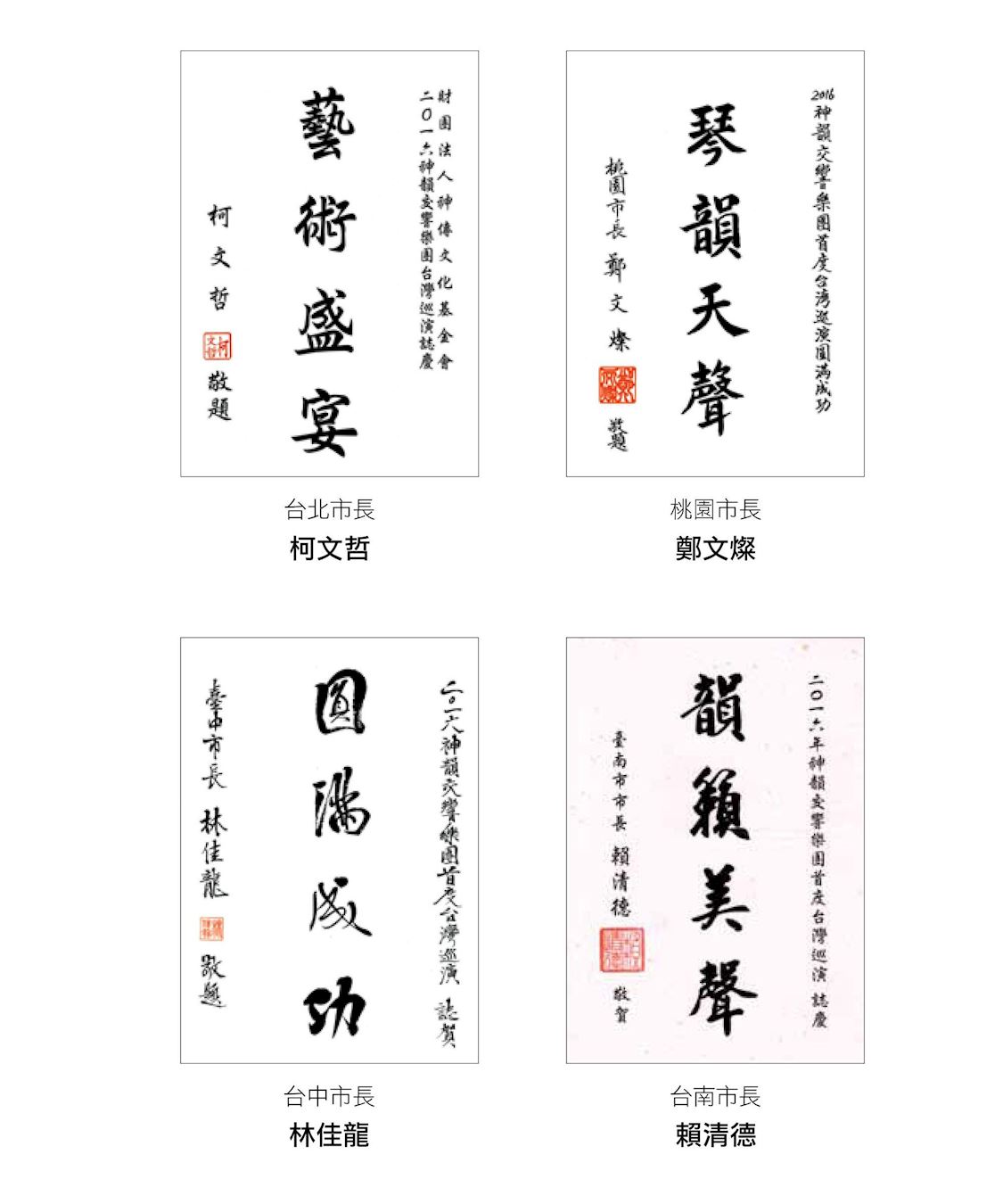 台北市长柯文哲发出“艺术盛宴”贺词,桃园市长郑文灿与台南市长赖清德分别以“琴韵天声”、“韵籁美声”推崇神韵交响乐团,台中市长林佳龙祝贺演出“圆满成功”。  图4:台北市长柯文哲、桃园市长郑文灿、台中市长林佳龙、台南市长赖清德发贺词祝贺神韵交响乐团演出 |
