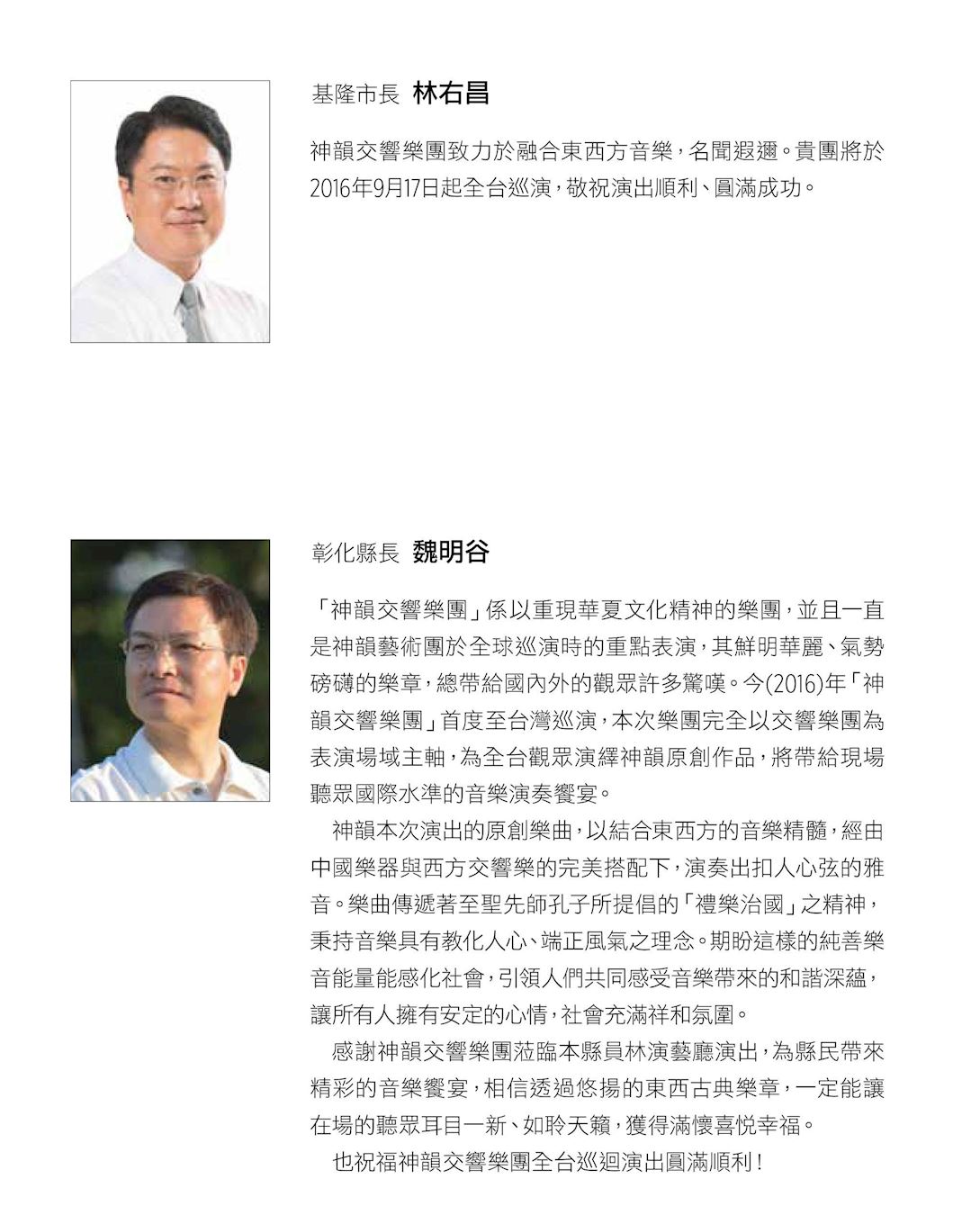 彰化县长魏明谷在贺文中称颂说,神韵交响乐团鲜明华丽、气势磅礴的乐章,总带给国内外的观众许多惊叹。神韵演出的原创乐曲,以结合东西方的音乐精髓,经由中国乐器与西方交响乐的完美璧合下,演奏出扣人心弦的雅音。神韵音乐具有教化人心、端正风气之理念,引领人们共同感受音乐带来的和谐深蕴。  图6:基隆市长林右昌、彰化县长魏明谷发贺文祝贺神韵交响乐团演出 |