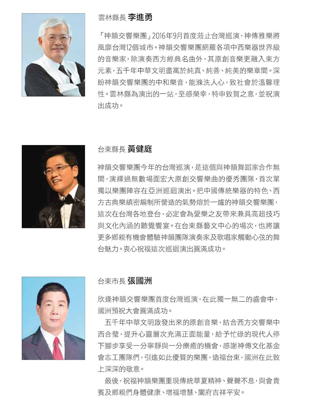 图7:云林县长李进勇、台东县长黄健庭与台东市长张国洲发贺文祝贺神韵交响乐团演出 |