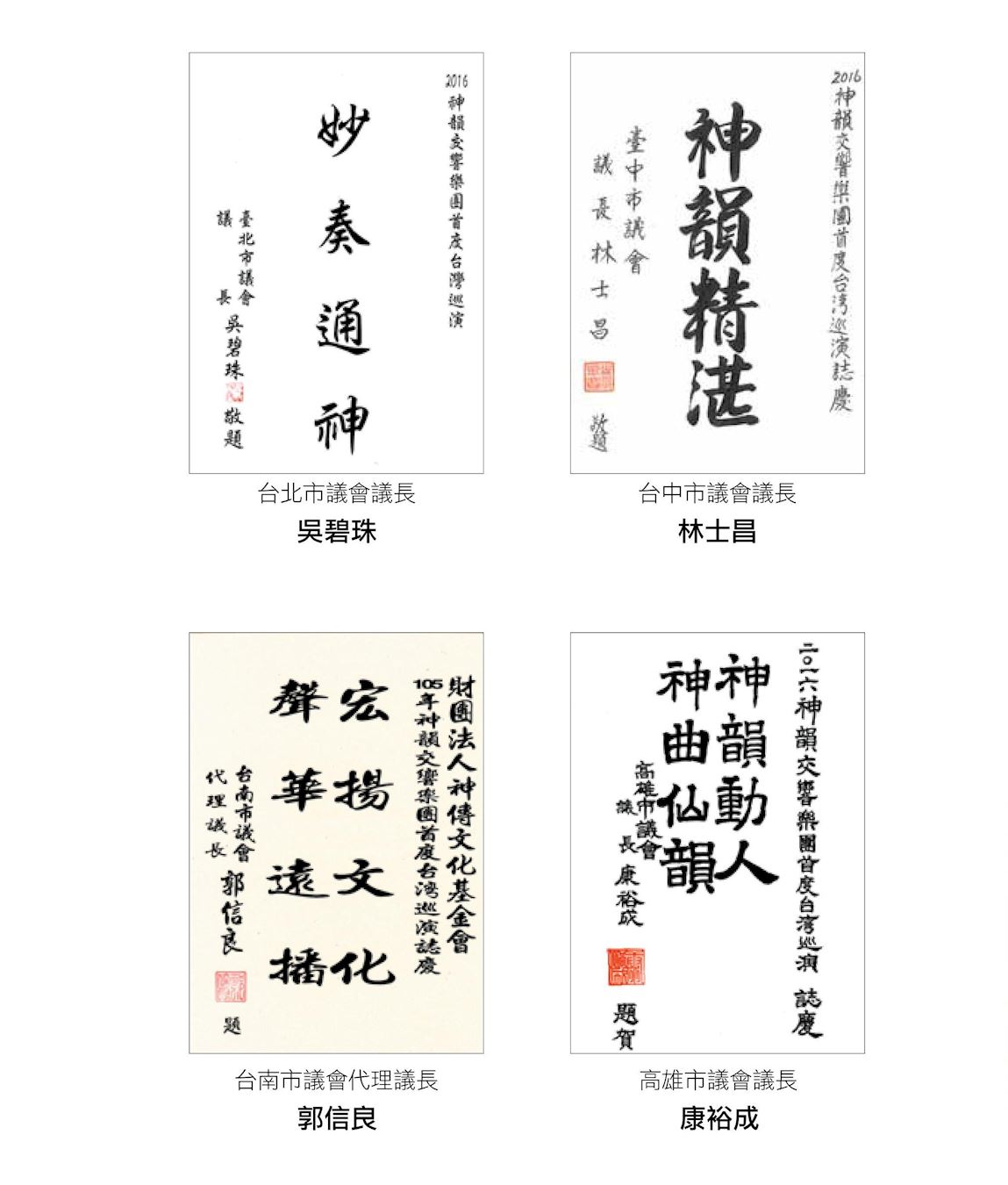 此外,台北市议会议长吴碧珠、台中市议会议长林士昌、台南市议会代理议长郭信良与高雄市议会议长康裕成,分别发出“妙奏通神”、“神韵精湛”、“宏扬文化、声华远播”与“神韵动人、神曲仙韵”赞扬神韵交响乐团。  图8: 台北市议会议长吴碧珠、台中市议会议长林士昌、台南市议会代理议长郭信良与高雄市议会议长康裕成发贺词祝贺神韵交响乐团演出 |