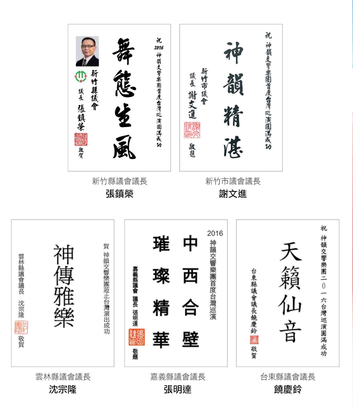 其它县市议会包括新竹县议会议长张镇荣、新竹市议会议长谢文进、云林县议会议长沈宗隆、嘉义县议会议长张明达、台东县议会议长饶庆铃、彰化县议会议长谢典霖与宜兰县议会议长陈文昌也代表当地民众与议会,发文迎贺神韵交响乐团首次莅临台湾巡演。  图9: 新竹县议会议长张镇荣、新竹市议会议长谢文进、云林县议会议长沈宗隆、嘉义县议会议长张明达与台东县议会议长饶庆铃发贺词祝贺神韵交响乐团演出 |
