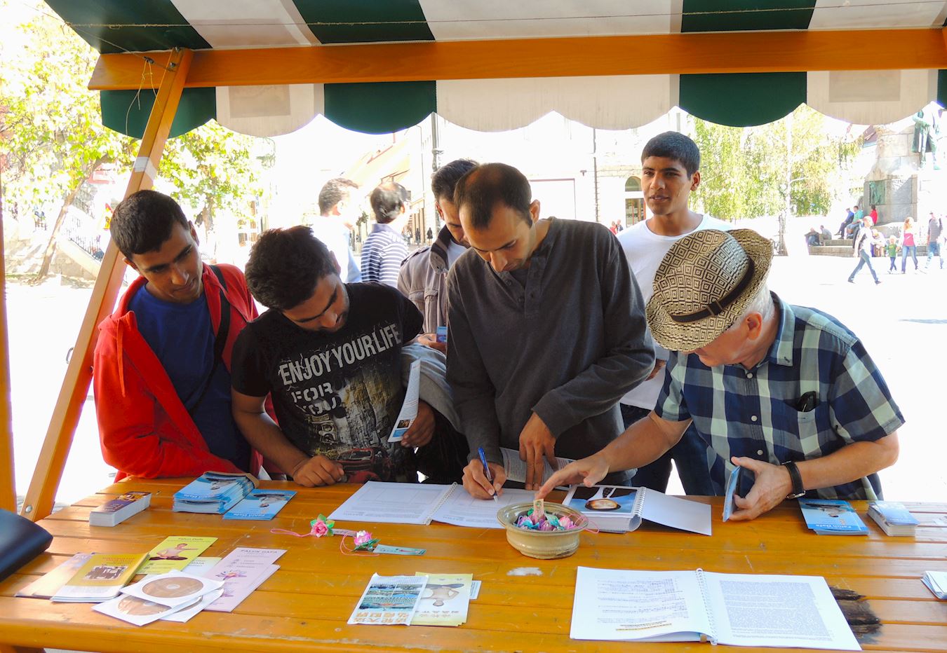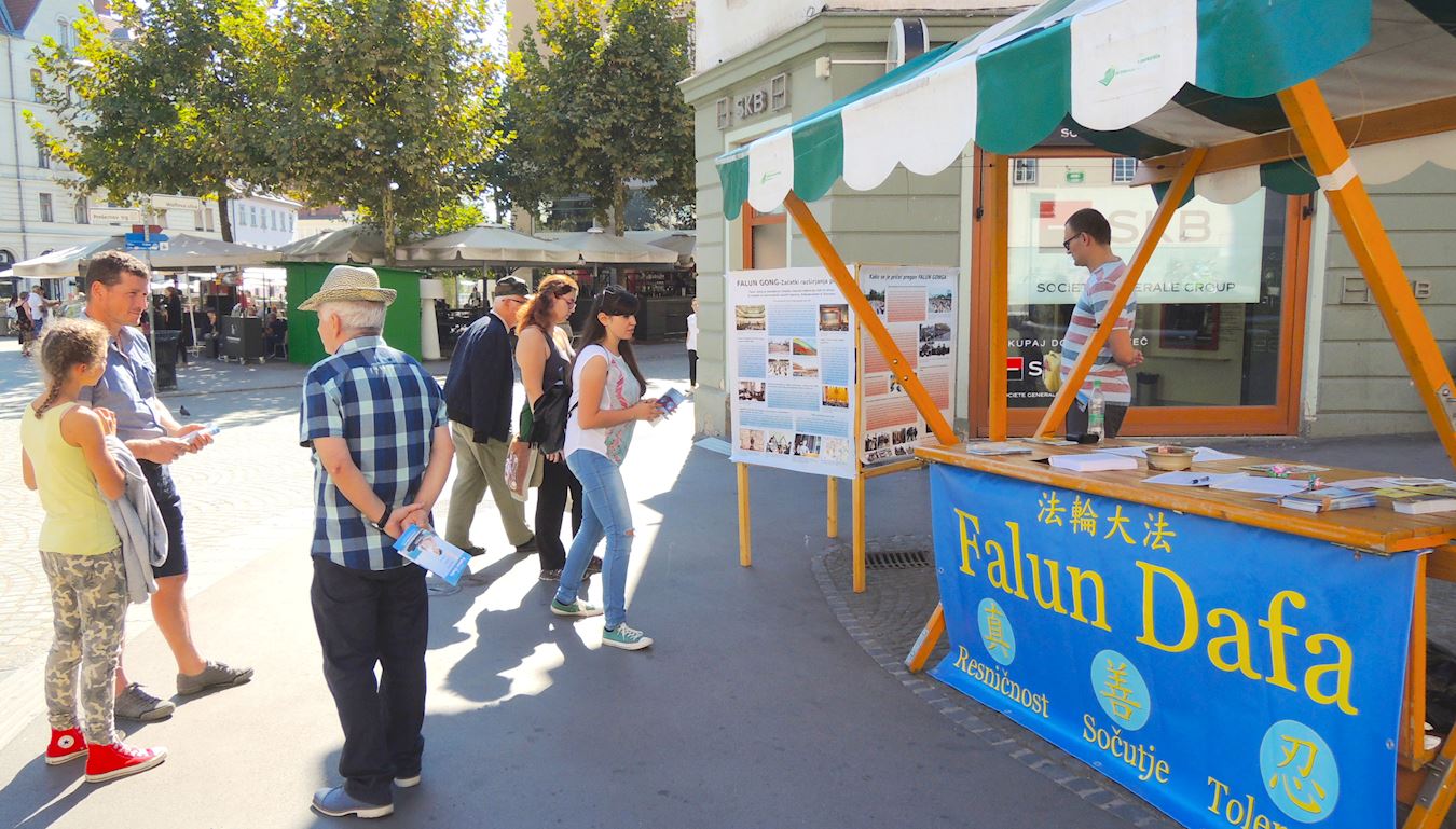 在活动现场,学员们摆放了真相展板后,同时在炼功音乐的伴随下,有的演示法轮功的第一至第五套功法,有的学员给过行人和游客派发真相传单,有的向人们讲述中共活摘法轮功学员器官的真相。听到活摘真相后,很多民众感到震惊,立即在“制止活摘、制止迫害”请愿书上签名。 一位来自印度的年轻游客听了法轮功学员讲述的真相后说,在中国发生的对法轮功的残酷迫害是很可怕的,他支持法轮功学员反迫害,并在“制止活摘、制止迫害”请愿书上签名。 两位斯洛文尼亚的女学生了解真相后签名支持制止迫害,之后还详细咨询了在哪里可以学炼这么好的功法,怎么和学员取得联系等等,获得答案后才高兴离开。 一位老人看了挂出的“真善忍”横幅后告诉学员:这种活动非常好,你们应该继续保持真善忍这种信念。