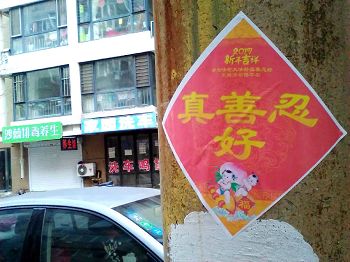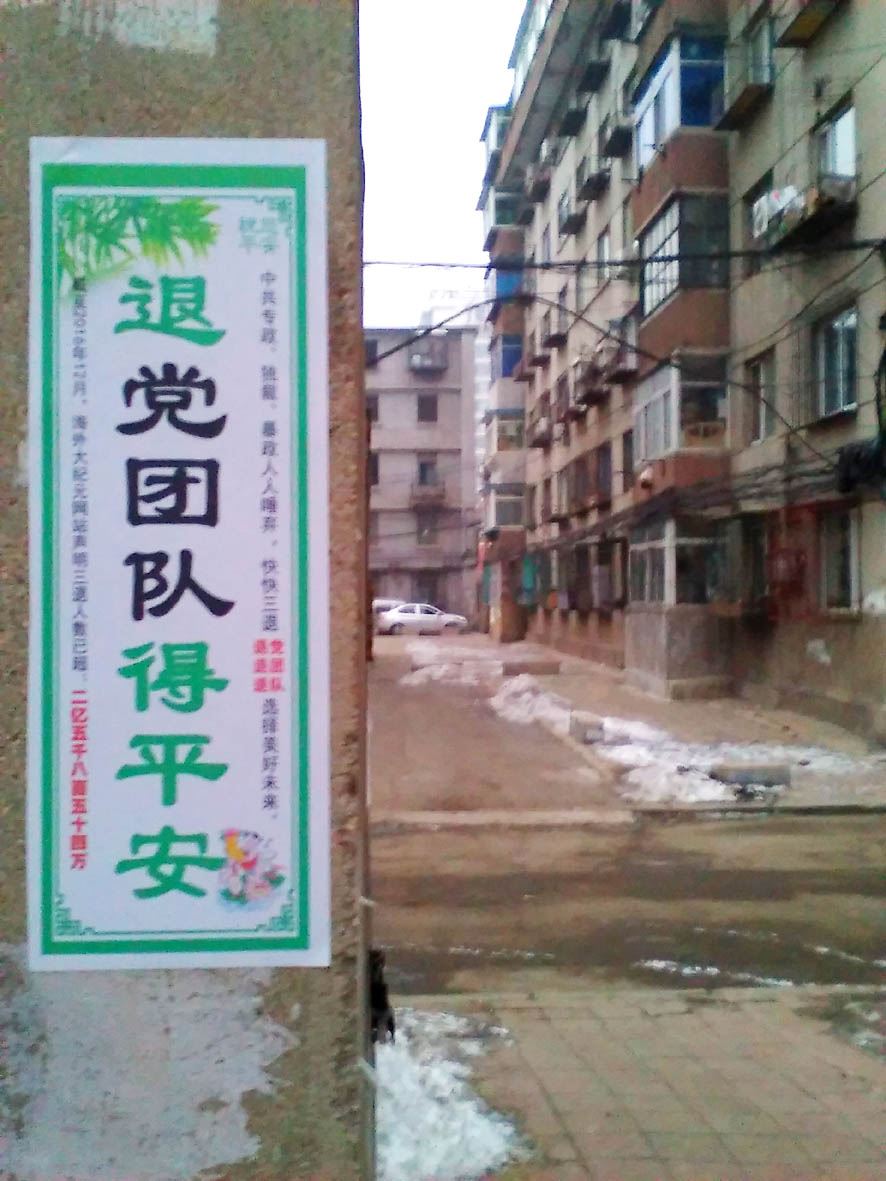 | 【明慧网二零一七年一月十四日】 吉林市街头真相海报吸引路人观看 元旦期间,鞍山地区悬挂条幅海报喜迎新年 近期在河北石家庄市区拍照的一些真相粘贴 二零一七年新年之际,辽宁省沈阳市居民区的法轮功真相 辽宁丹东市真相树挂 法轮大法真相海报在山海关 法轮大法真相海报在绥中 湖北荆州市城乡海报条幅传真相 近期出现在山东临沂市沂河、沭河岸边的真相海报。 吉林市街头真相海报吸引路人观看