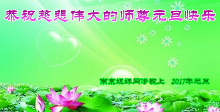 感恩师尊!弟子们牢记师尊教诲,学好法,精進实修,做好三件事,多多救人。弟子会走好修炼道路,跟师父回家,请师尊放心。谢谢师尊! 江苏省南京姐妹大法弟子恭祝慈悲伟大的师尊元旦快乐!