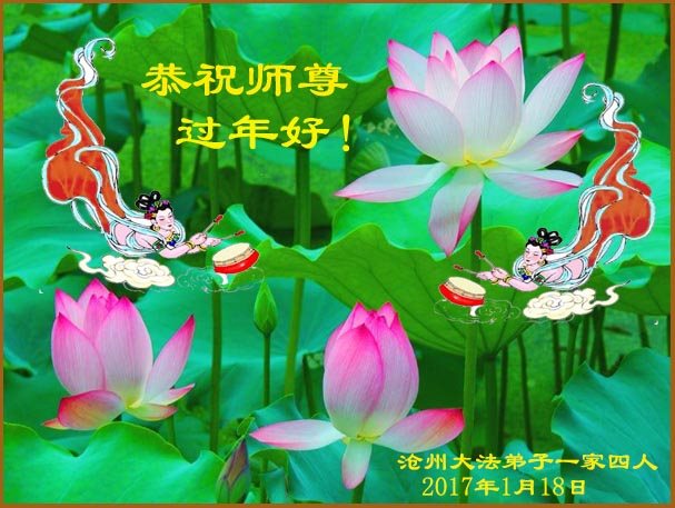 沧州石化全体大法弟子恭祝师父新年快乐!师父您好!师父过年好!师父您辛苦了,谢谢师父的慈悲救度与呵护! 弟子一定听师父的话,放下一切人心,精進实修,认认真真的做好三件事,跟师父回家。 沧州石化全体大法弟子 2017.1.20 河北省沧州石化大法弟子一家四人给师父拜年!