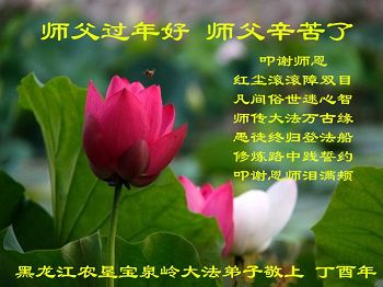 又是一年辞旧迎新,是师尊一次次用巨大的承受换来弟子们修炼的机缘与世人的觉醒得救,弟子心中满满的感恩,也唯有更加勇猛精進才能回报师尊! 弟子们一定修好自己,做好三件事,让更多的世人明白大法真相,知道法轮大法好!真善忍好!愿有缘人不辜负自己来时的愿! 中原油田一大法弟子恭祝慈悲伟大的师尊新年快乐!