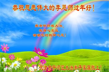 在新年到来之际,恭祝慈悲伟大的师父新年快乐!弟子定谨记师尊教诲,兑现史前洪愿,随师回到我们最初的家园! 天津市宁河区大法弟子家属恭祝李恩师过年好!
