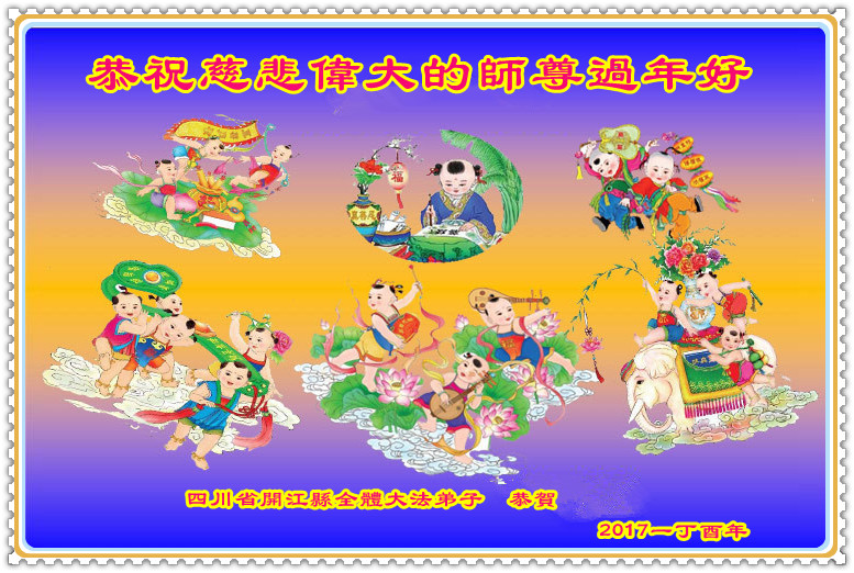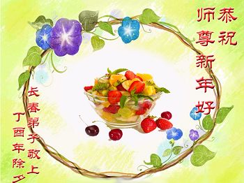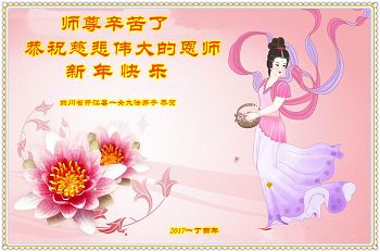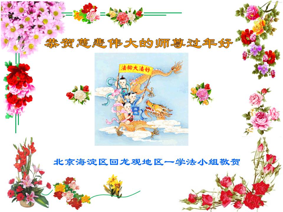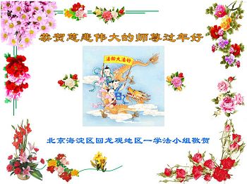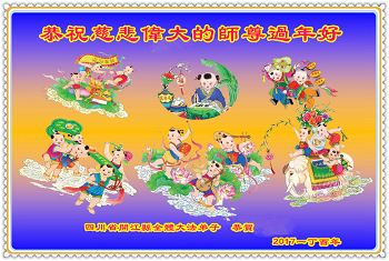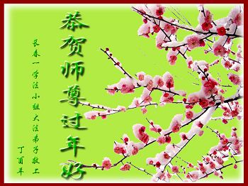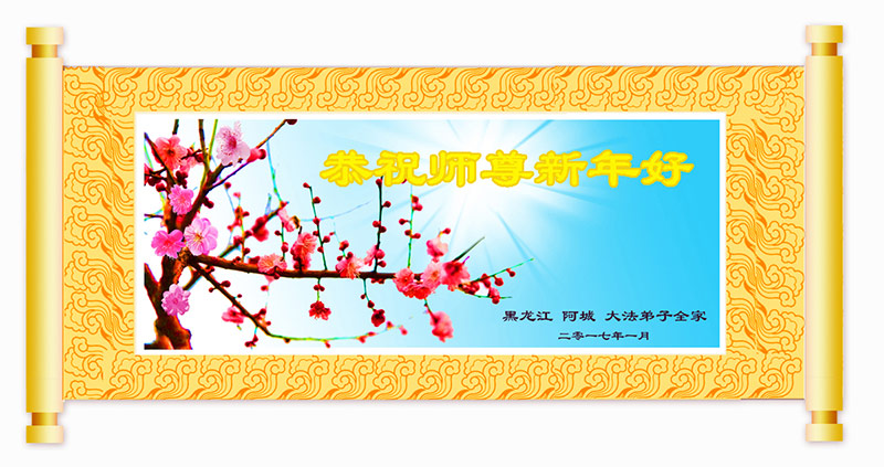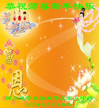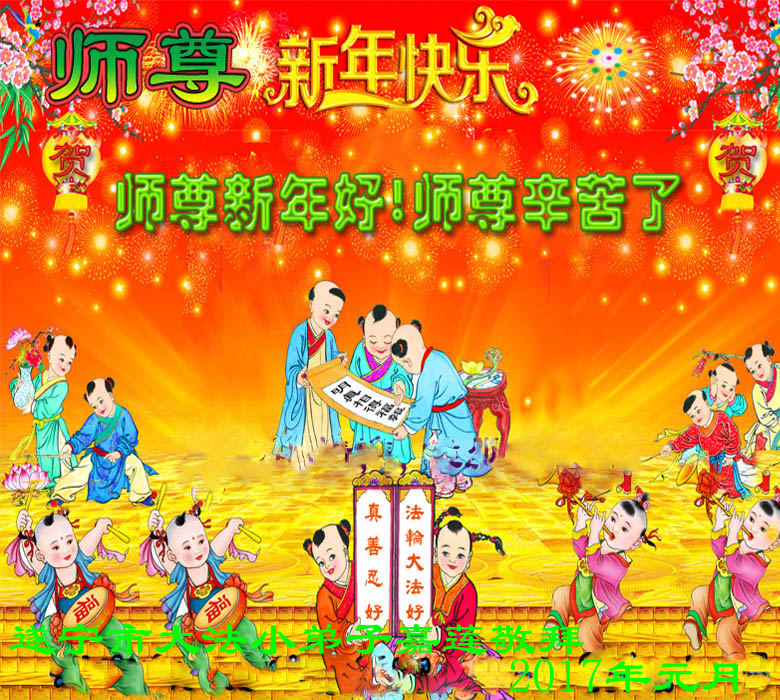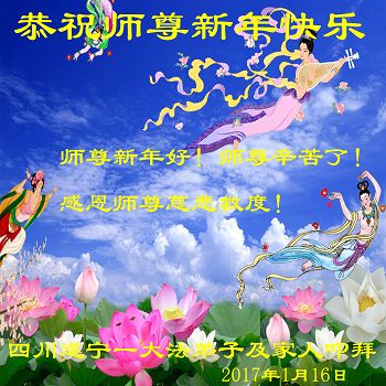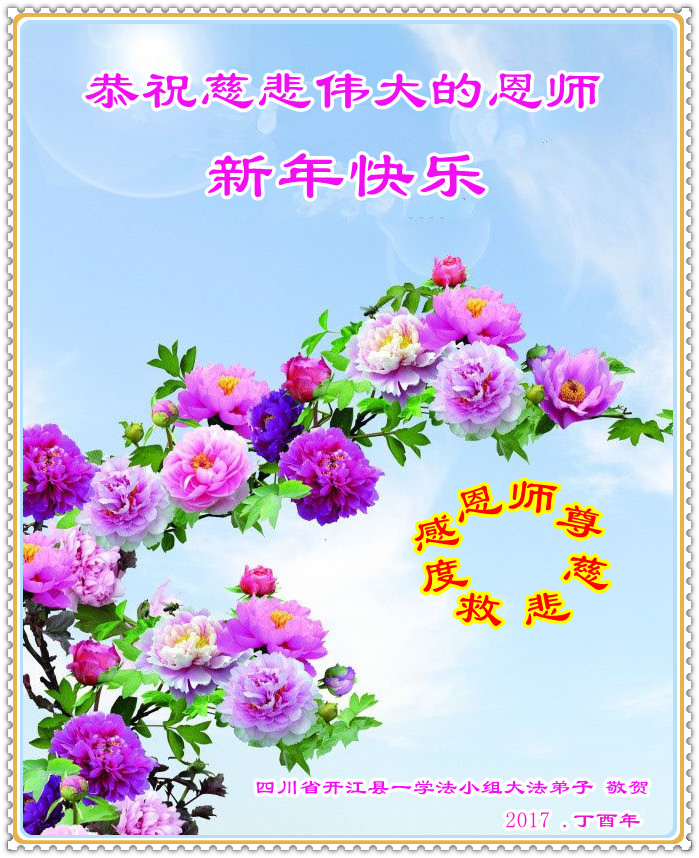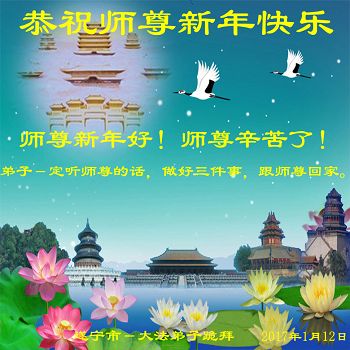 在过去的一年里,我们都在做三件事,可是心里还有很多执着的人心。现在我们认识到了,在新的一年里,我们会更加努力修好自己,去掉人心。在做好三件事中,不断在法中提升自己,以法为师,在正法中摆正自己的位置,圆容师父所要的,做一个真正的大法徒,不辱使命,正念正行,回报师父的洪恩,感谢师尊对我们的慈悲救度! 四川省遂宁市北门桥头学法小组全体大法弟子向师尊拜年!恭祝尊敬的师尊新年好!
