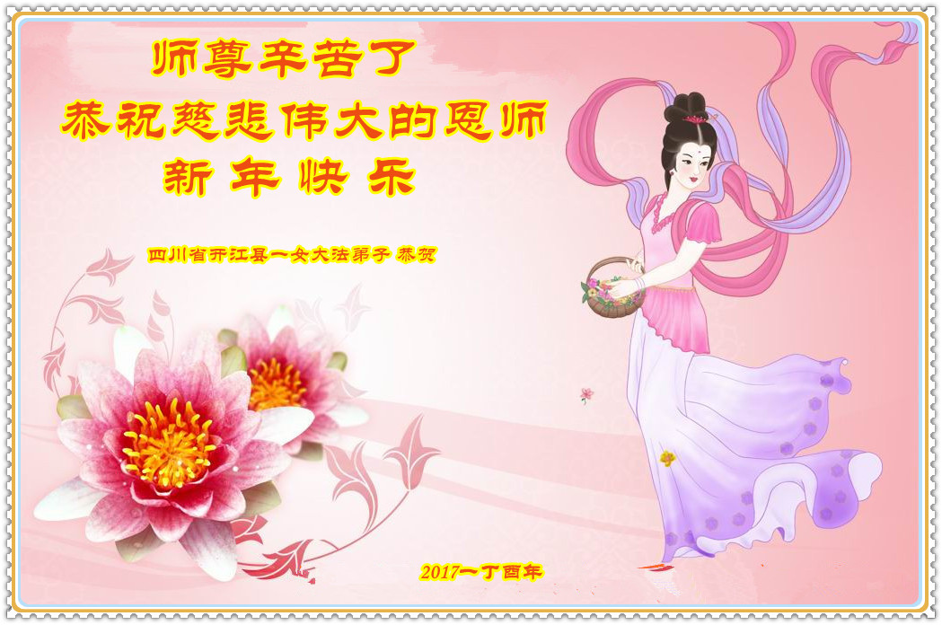 感谢慈悲伟大师尊的救度之恩,弟子一定做好三件事,多救人,真修向内找,走好师尊安排的路,达到新宇宙的标准。叩拜师尊! 四川省达州市开江县一女大法弟子恭祝慈悲伟大的恩师新年快乐!