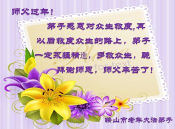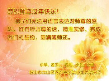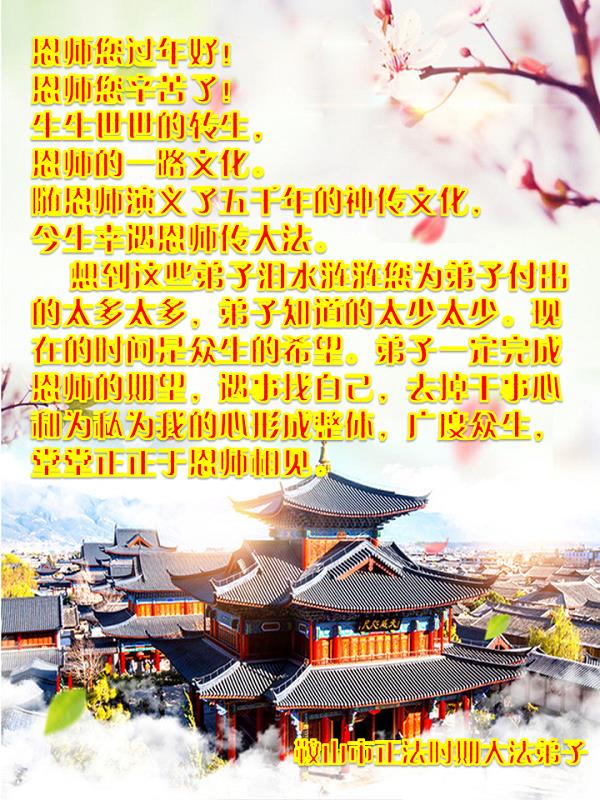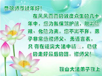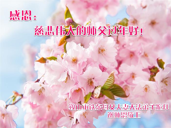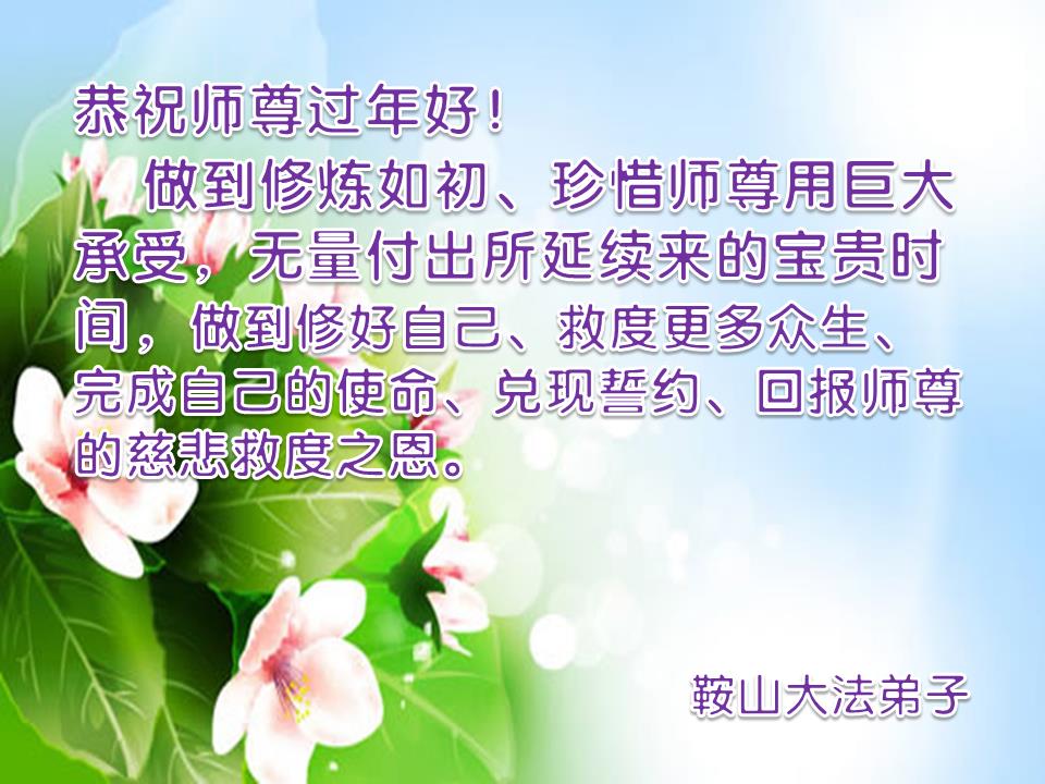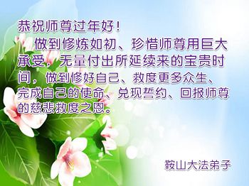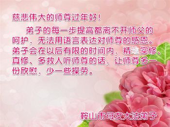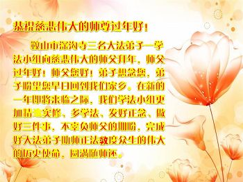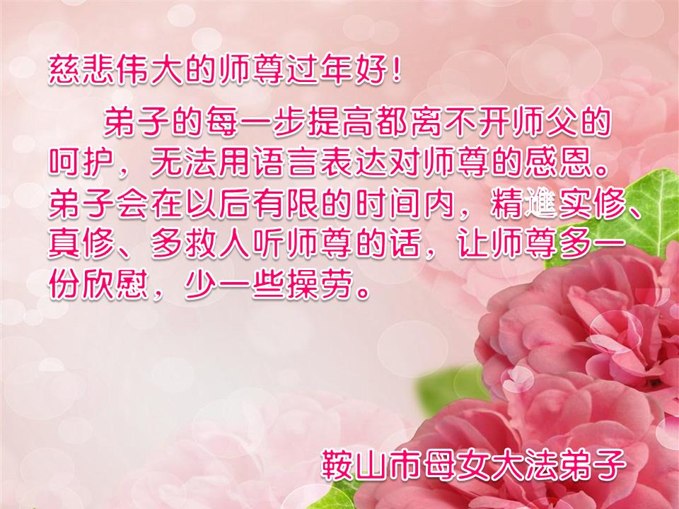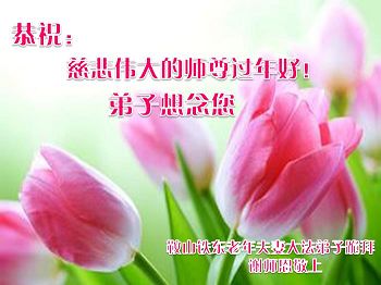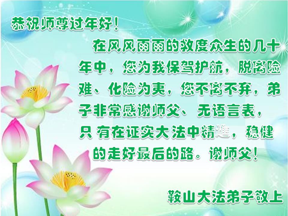 在新的一年里,弟子一定按照师父要求的去做好自己应该做好的,感谢师父慈悲救度之恩。 叩拜师父! 辽阳县大法弟子 辽宁省鞍山大法弟子恭祝师父过年好!