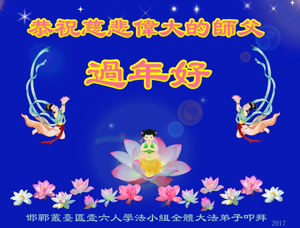 感恩师尊的慈悲救度和呵护,要精進实修,不负誓约,珍惜正法时期的每分每秒! 河北省邯郸市丛台区一六人学法小组全体大法弟子恭祝慈悲伟大的师父过年好!