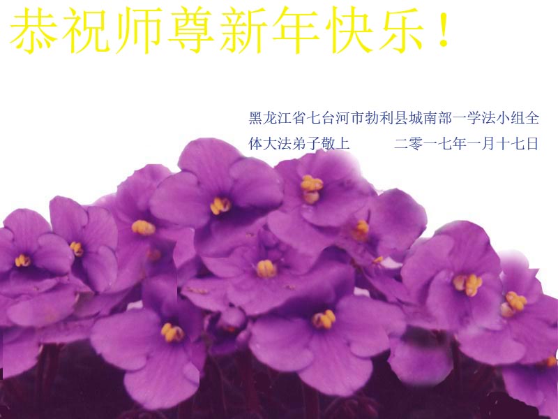 我们全家都无限感恩师尊呵护到今天!无法用语言能表达的了,只有精進实修,踏踏实实做好三件事,按照大法严格要求自己,走好以后的路。祝师尊永远快乐! 弟子叩拜于丁酉年! 黑龙江省七台河市勃利县城南部一学法小组全体大法弟子恭祝师尊新年快乐!