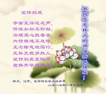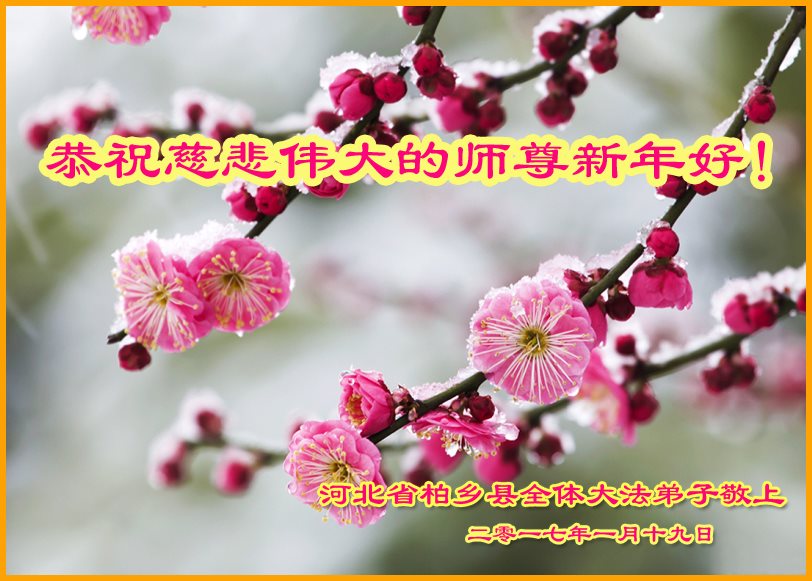 | 【明慧网二零一七年一月二十四日】(明慧网通讯员大陆报道)在2017年中国传统新年到来之际,众多的大法弟子通过明慧网,把自己的心声传递给慈悲伟大的李洪志师父。 法轮大法由李洪志师父传世近二十五年,人传人、心传心,近亿有缘人走入法轮大法修炼,尤其大陆大法弟子经历了、也正在经历着中共十七年的迫害。然而,真修大法弟子们象冰雪中梅花,依然绽放,而且更加纯净、光明、成熟,证实着师父伟大、“真、善、忍”大法的伟大。 河北省秦皇岛地区大法弟子在给李洪志师父的中说:“过去的一年里,秦皇岛地区的大法弟子又成熟了许多,在三件事的配合上越来越好。不断的努力放下自我并向内找,都知道时间的紧迫,在救更多的人。” 山东威海大法弟子说:“过去的一年里一关未平,一关又起,多亏师父加持,一步一步走出来,回首往事什么也不是了,放下了执着,身轻体健,精神集中,干什么事都顺畅。” 四川广元苍溪大法弟子表示:慈悲伟大的师父把我们从苦海中捞起,使我们从一个满身业力的人脱胎换骨,身心健康,心胸豁达,快乐!向上!能善待身边的每一个人,能为众生的得救无私的付出。