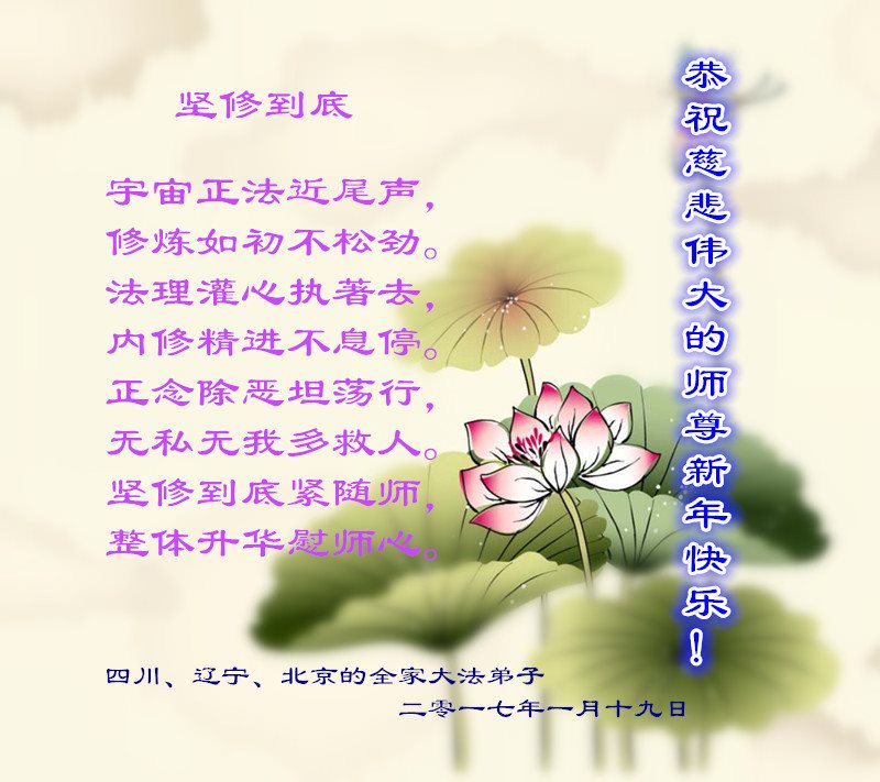 四川、辽宁、北京的全家大法弟子恭祝慈悲伟大的师尊新年快乐!河北邢台市柏乡县大法弟子:我们是广宇中最幸运的生命在丁酉新年到来之际,河北省邢台市柏乡县全体大法弟子向慈悲伟大的师尊问好!恭祝师父新年好! 能成为师尊的弟子,我们深感自己是广宇中最最幸运的生命;有师尊的大法作指引,我们无论遇到什么艰难险阻都能看清方向;听师父的话,做师父的好弟子,是我们一直坚持走的路;修去人心执着,放下人的观念与圆滑,我们不要人的聪明,我们就做师父纯净单纯的弟子;学好法,炼好功,发正念,除邪灵,讲真相,救众生,师父怎么说,我们就怎么做。 我们知道正法结束的时间已经临近,法正人间在即,但我们还有许多的不足需要弥补,有许多的有缘人还未让他明白真相,我们要抓紧时间,听师父的话,做师父的好弟子,精進再精進,让师父高兴! 河北省邢台市柏乡县全体大法弟子跪拜师恩 二零一七年一月十九日 山东威海大法弟子:放下人心,干什么都顺畅,在此恭祝师父新年好!感恩师父的慈悲救度! 元旦刚过,大年即到。时间对众生来说真是师父说的那样,瞬间即逝再也找不回来了。只有珍惜每一秒,做好师父让做的三件事——学法炼功,发正念,讲清真相,才不辜负师父的慈悲救度,助师正法。 由于对情的不舍,过去的一年里一关未平,一关又起,多亏师父加持,一步一步走出来,回首往事什么也不是了,放下了执着,身轻体健,精神集中,干什么事都顺畅。 一切的一切师父都安排好了,就等着我们去做,切身体会到了信神有神在。感恩师父的慈悲救度,替明白真相的有缘人谢谢师父!合十! 山东威海一大法弟子 河北秦皇岛大法弟子:师尊慈悲呵护与救度,弟子修炼更成熟了河北省秦皇岛全体大法弟子恭祝师尊过年好! 2017年即将到来,过去的一年里,秦皇岛地区的大法弟子又成熟了许多,在三件事的配合上越来越好。不断的努力放下自我并向内找,都知道时间的紧迫,在救更多的人。 在过去的一年深刻体会到师父对弟子们无处不在的慈悲呵护与救度,谢谢师父的慈悲苦度! 我们会在新的一年,精進不停,继续做好三件事,让师父少操心。 秦皇岛全体大法弟子跪拜谢师恩 山西省平定县姜家沟幸福大厦一大法弟子携全家七口向慈悲伟大的师尊拜年!师父伟大法伟大 信师信法不会怕 时时刻刻想着法 正念善念救人佳 一思一念修自己 欲望执着人心去 利益得失不去想 修炼路上无阻挡 辽宁盘锦市大法弟子:正念十足的走好师父精心安排的正法回归路师父辛苦了!盘锦市大法弟子恭贺至亲无上的师父过年好! 是您承载着亿万年的艰辛,亲驾法船,为我们导航返本归真之路,得法的生命欢呼雀跃,对大法的感恩无法言表。我们本性觉醒,生命的真意就是为大法而来,讲真相、救众生是我们来世时的誓约大愿,能否兑现誓愿已经成为我们的生死见证,不辱使命,义无反顾、正念十足的走好师父精心安排的正法回归路。 盘锦市大法弟子 合十 “整体升华上来了,救度更多的众生” 山东潍坊诸城全体大法弟子恭祝师尊新年快乐!苍宇虔诚祝福 天体真挚感恩 在师尊慈悲洪大呵护呼唤下,我们整体升华上来了、逐渐神起来了、成熟起来了! 尊敬的师尊放心吧!您的弟子,大法成就的大法徒,听您的话,走好走正走在神的路上! 整体配合、整体提高。有师尊在、有大法在。我们会真正神起来的!用师尊教导的洪大慈悲,救度更多的众生! 热切盼望与师尊早日大团圆! 虔诚的感恩至高无上的师尊! 跪拜 合十 十多年来无论严寒酷暑,坚持集体学法──辽宁省本溪一学法小组的大法弟子恭祝慈悲伟大的师尊过年好!师尊啊,弟子想念您!是您看护着弟子,保护着弟子,承受着巨难,使我们学法小组平稳的走到今天,我们的一切都来自于师尊的呵护。借皇历过年之际,我们学法小组的全体大法弟子拜师尊谢师恩! 我们学法小组的大法弟子,年龄在四十到接近八十岁不等,共计十二人。平常不分节假日,没有礼拜天(只有过年休息几天)每天都坚持学法救人。十多年来无论严寒酷暑,风霜雨雪,疯狂迫害,我们每天都坚持集体学法。 我们的心愿是——师尊话儿记在心,学法修心找内因。险恶迫害不畏惧,兑现誓约救世人。 本溪一学法小组的大法弟子跪拜 四川广元苍溪大法弟子:“只要众生能得救,再苦再累我们也无怨无悔!”四川广元苍溪全体大法弟子恭祝慈悲伟大的师父新年快乐! 在此我们感谢慈悲伟大的师父把我们从苦海中捞起,为我们承受一切,为我们净化身体,使我们从一个满身业力的人脱胎换骨,身心健康,心胸豁达,快乐!向上!能善待身边的每一个人,能为众生的得救无私的付出。只要众生能得救,再苦再累我们也无怨无悔!在这最后有限的时间里,我们要修好自己多救人!跟上师父正法进程,反迫害,扬正气,驱邪灵,救众生,兑现神圣的誓约,跟随师父圆满回家园! 珍惜大法 坚定修炼大法不可动摇 湖北省咸宁市中心城大法弟子给师父拜年!慈悲伟大的师父:您在正法,天体重组,佛光普照乾坤,广大众生得到救度。在这普天同庆佛恩浩荡的日子里,咸宁市中心城大法弟子以万份喜悦的心情,迎来了中华民族的传统节日——丁酉年新年佳节,迎来了正法洪势救人更加深入洪大的一年。 慈悲伟大的师父,我们都是在大法中修炼了二十多年的大法弟子,经过了风风雨雨的考验,我们在神的路上走过了许多魔难,闯过了大魔头发起的史无前例的邪恶迫