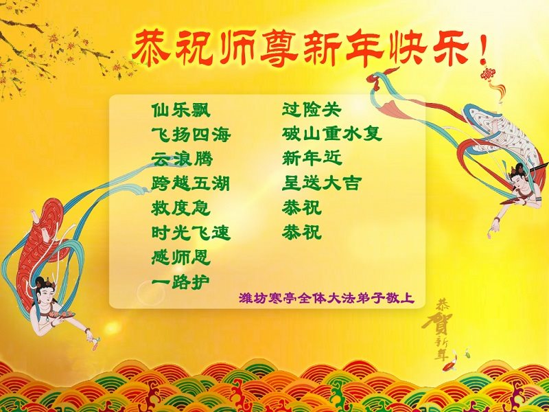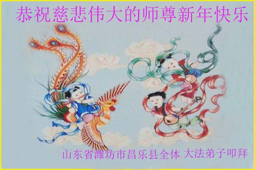 仙乐飘 飞扬四海 云浪腾 跨越五湖 救度急 时光飞速 感师恩 一路护 过险关 破山重水复 新年近 呈送大吉 恭祝 恭祝 山东省潍坊大法弟子恭祝慈悲伟大的师尊新年快乐!