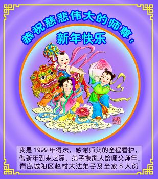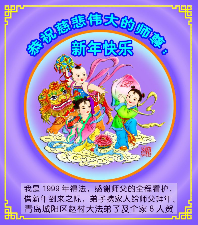 山东省青岛城阳赵村大法弟子及全家8人给师父拜年:恭祝师尊新年快乐!