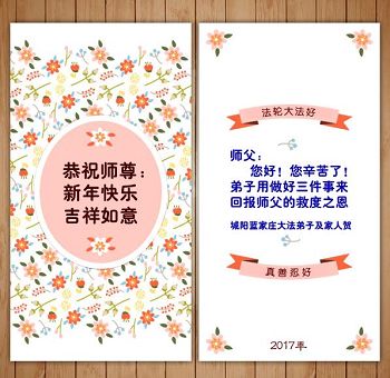 我们学法小组七人向师尊致以诚挚的问候,师尊过年好,师尊您辛苦了! 在新的一年里,我们一定要多学法、多救人。整体配合、踏踏实实的修好自己,做好三件事。回报师尊为呵护弟子巨大的付出与承受。谢谢师尊! 山东青岛平度一学法小组全体弟子 二零一七一月二十日 山东省青岛一学法小组大法弟子恭祝师尊鸡年新年快乐!