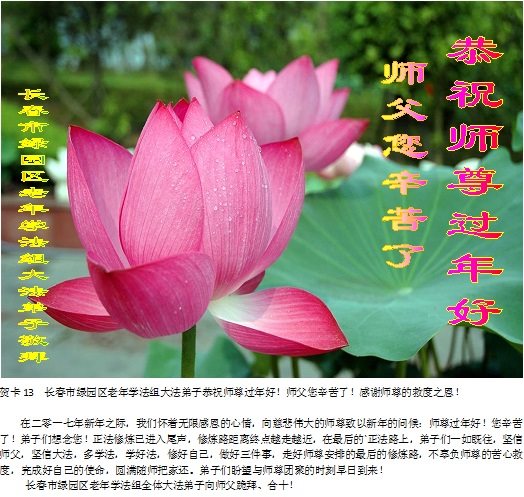 在二零一七年新年之际,我们怀着无限感恩的心情,向慈悲伟大的师尊致以新年的问候:师尊过年好!您辛苦了!弟子们想念您! 正法修炼已進入尾声,修炼路距离终点越走越近,在最后的、正法路上,弟子们一如既往,坚信师父,坚信大法,多学法,学好法,修好自己,做好三件事,走好师尊安排的最后的修炼路,不辜负师尊的苦心救度,完成好自己的使命,圆满随师把家还。弟子们盼望与师尊团聚的时刻早日到来! 长春市绿园区老年学法组全体大法弟子向师父敬拜、合十! 吉林省长春大法弟子全家恭祝慈悲伟大的师尊过年好!师父您辛苦了!感谢师尊的救度之恩!