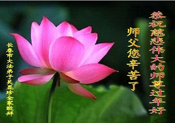 弟子遵循师尊的教诲,多学法,向内找,修好自己,做好三件事,不辜负师尊的慈悲苦度。愿师父少一份操劳,多一份欣慰。谢谢师父的救度之恩!弟子向师父跪拜合十! 吉林省长春大法弟子新英祝贺师尊新年快乐!