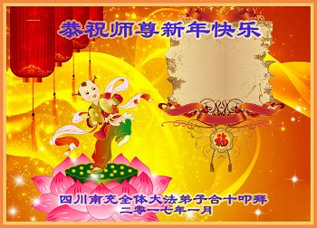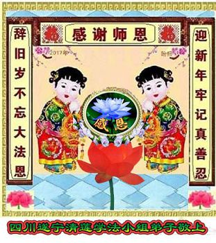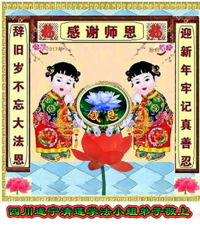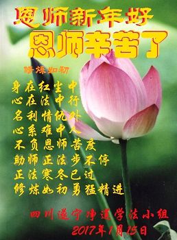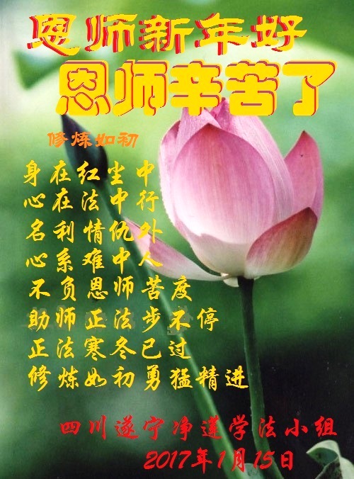 二零一六挥手去 师尊洪恩救穹宇 得救众生好几亿 世人醒悟明真谛 扫除余恶光明显 末劫归正法轮旋 感恩师尊传大法 法徒助师倍精進 实修做好三件事 洪愿一了随师还 四川遂宁同心学法小组大法弟子恭祝师尊新年快乐!