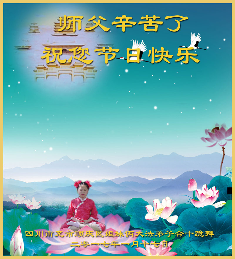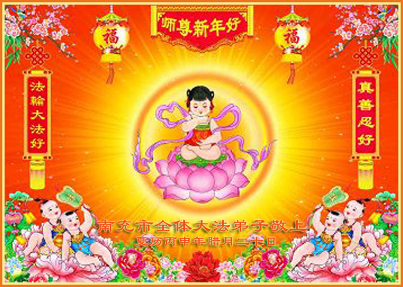师尊好!师父您辛苦了!我们姐妹俩大法弟子在新的一年里努力学好法,做好三件事,和整体大法弟子配合好,向世人讲清真相,多救众生,兑现我们的史前誓约,完成来前大愿,圆满随师还。 四川南充市全体大法弟子恭祝师尊新年好!