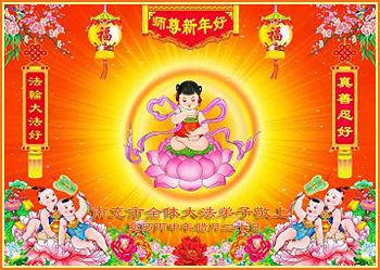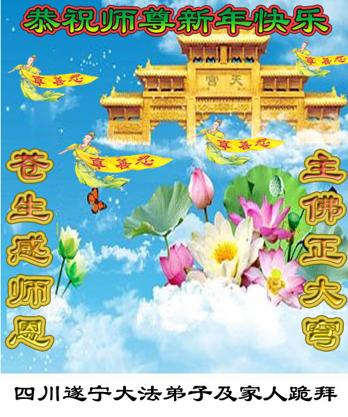 人神迎新年 法光照宇寰 法轮大法好 真相遍地传 新宇福寿全 师恩浩无边 弟子叩首谢 报恩永无限 四川遂宁清莲学法小组大法弟子恭祝师尊新年快乐!