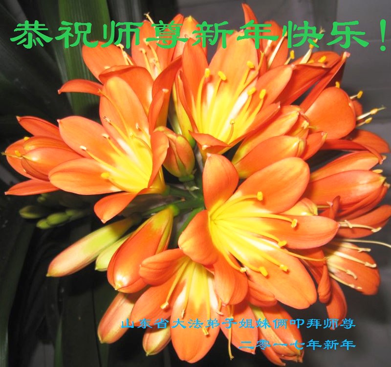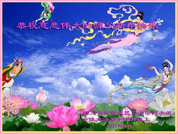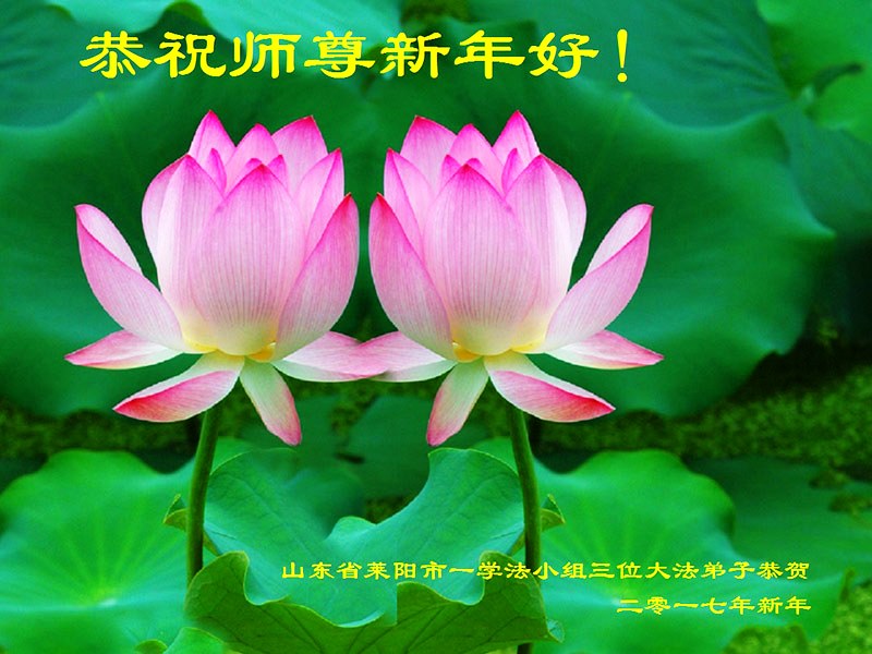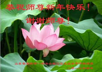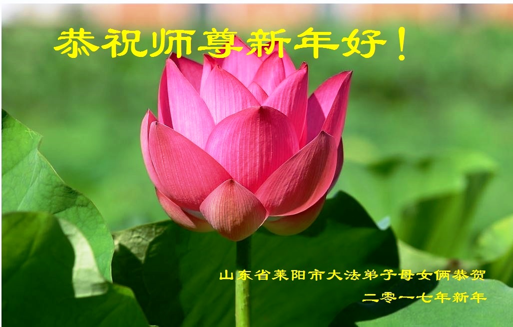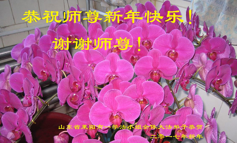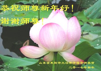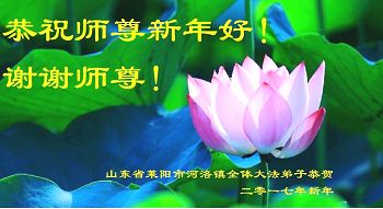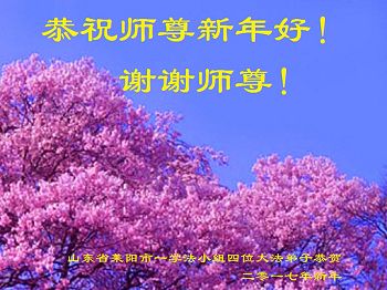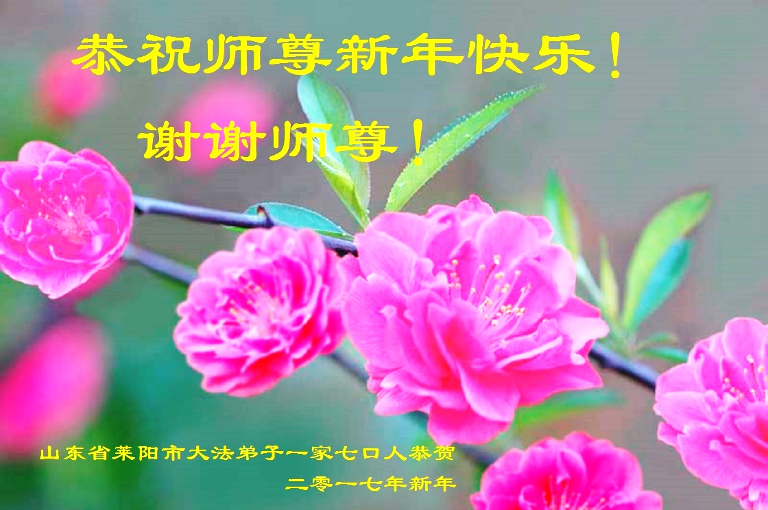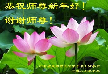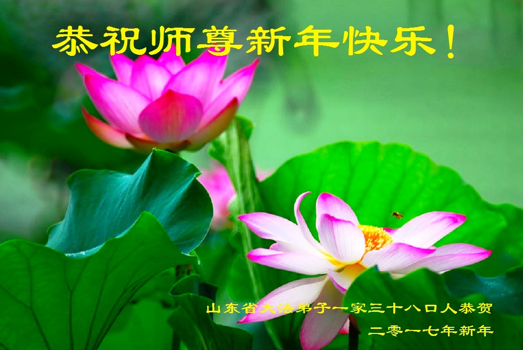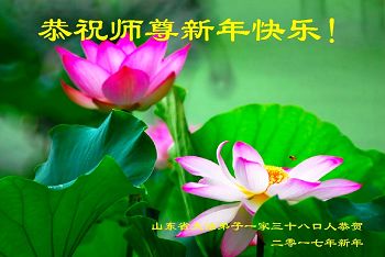 师父您好!师父您辛苦了!在二零一七年新年到来之际,我们小组的四位弟子深深的感谢师尊的救度之恩!在新的一年里,我们会更加精進实修,谨遵师父的教诲,认认真真的多学法,学好法,发好正念,在修好自己的基础上,多救人。完成使命,兑现誓约,让师父少一份操劳,多一份欣慰。 山东省大法弟子一家三十八口人恭祝慈悲伟大的师尊新年佳节快乐!