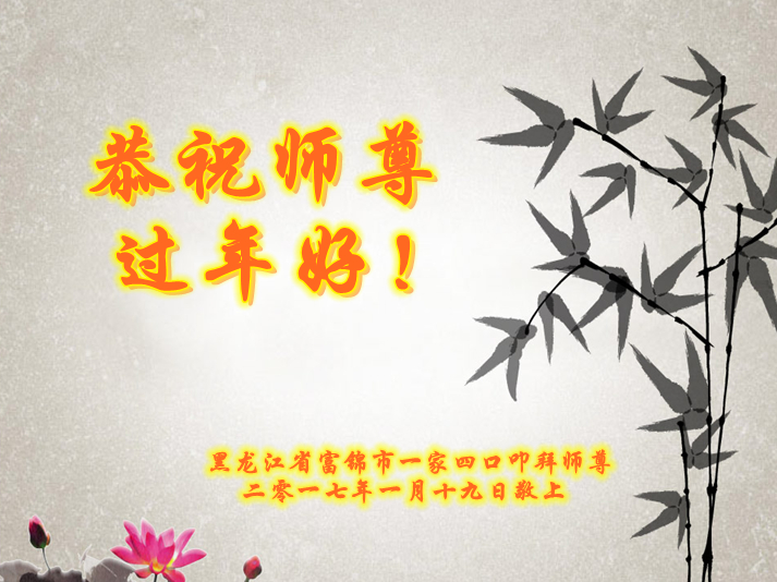 感恩慈悲伟大的师父的救度!弟子叩谢师恩!弟子无法用人间的语言来表达师父给予弟子的一切一切,弟子唯有努力做好三件事,少让师父操心,在最后的日子里,走好走正修炼的路! 弟子叩拜师父! 2017年1月16日 黑龙江省佳木斯市汤原县一老年大法弟子代表全家恭祝师尊新年好!