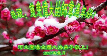 在新的一年里,弟子们一定会更加勇猛精進,珍惜时间,坚定正念,脚踏实地的做好三件事,走好最后的路,跟师父回家! 佳木斯学法小组 2017年1月19日 河北省大法弟子及全家恭祝师尊新年快乐!