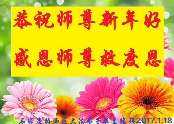 师父,新年好!至此中国传统新年到来之际,石家庄井陉县全体大法弟子恭祝师尊新年快乐!弟子们一定努力做好三件事!早日随师返回家园!盼望师父能早点回神州大地!师父辛苦了! 河北衡水市大法弟子恭祝慈悲伟大的师尊过年好!