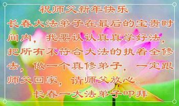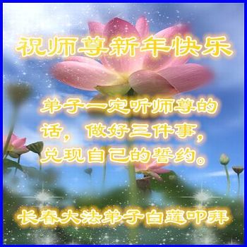 长春大法弟子一定听师尊的话,做好三件事,兑现自己的誓约。长春大法弟子白莲叩拜 吉林省长春大法弟子恭祝师父新年快乐!